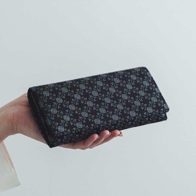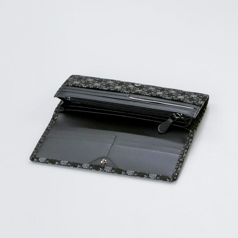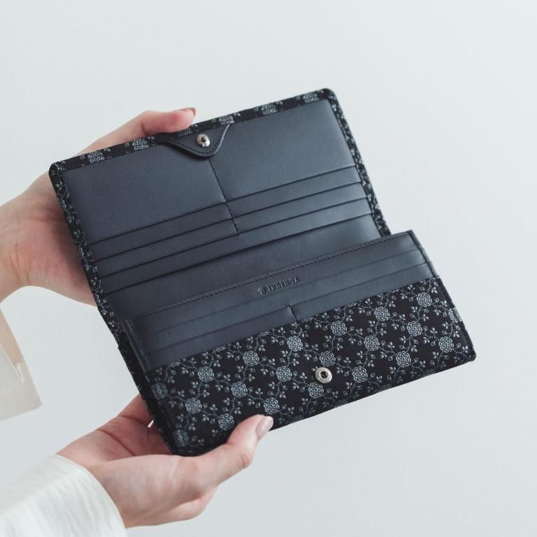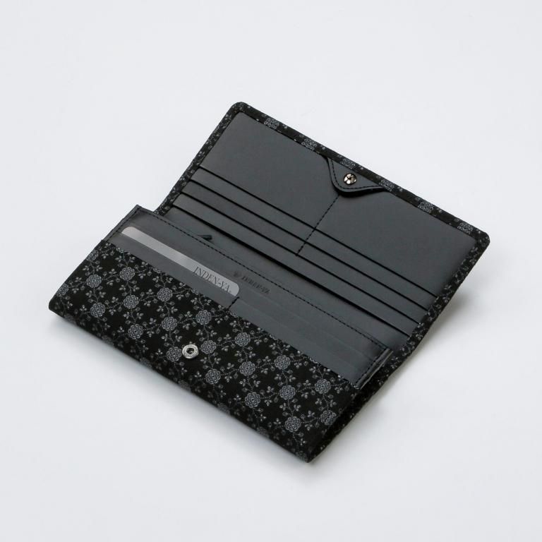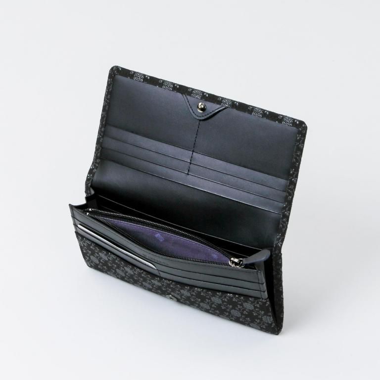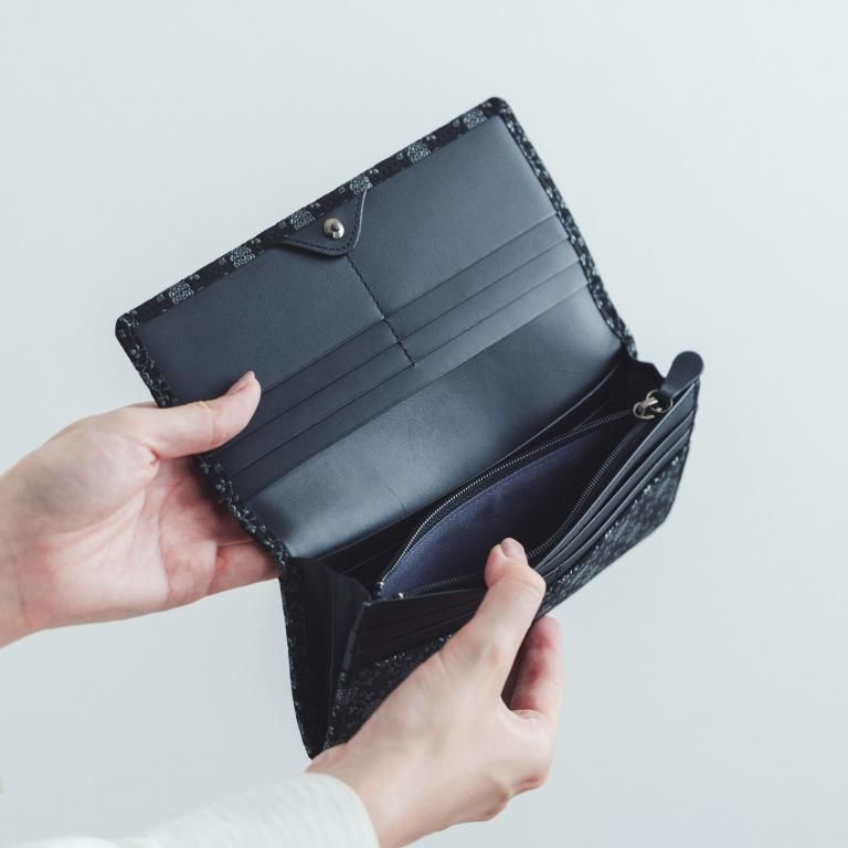 印伝革ならではの手触りと、艶やかな漆模様を贅沢に愉しめるようにデザインしたレディースの長財布。