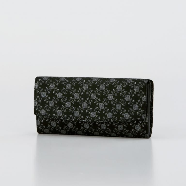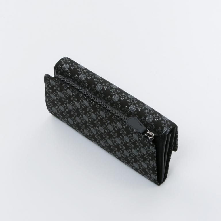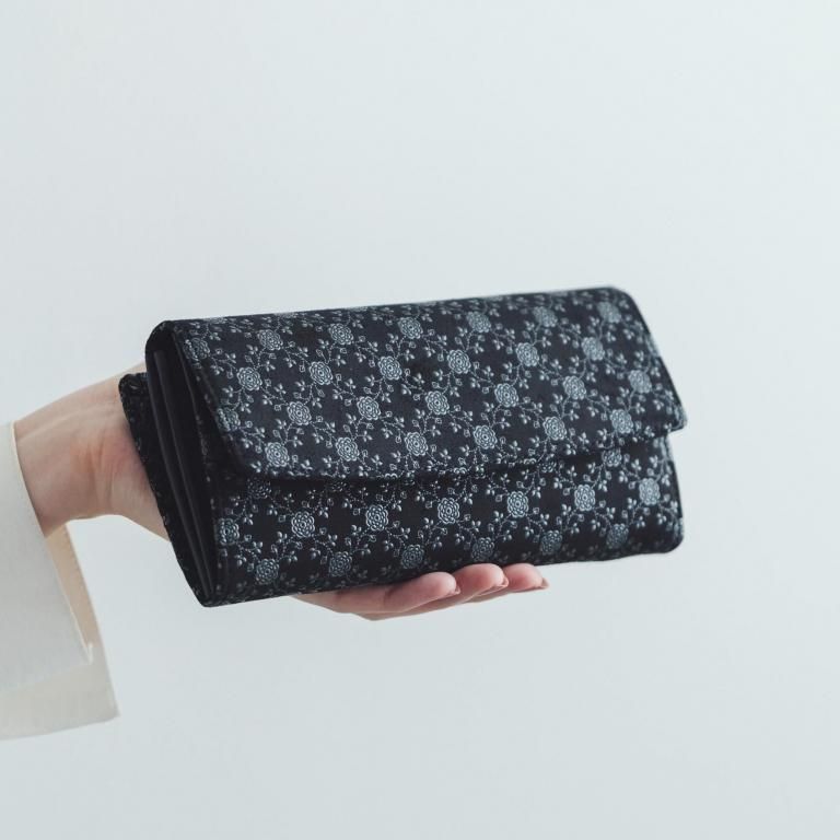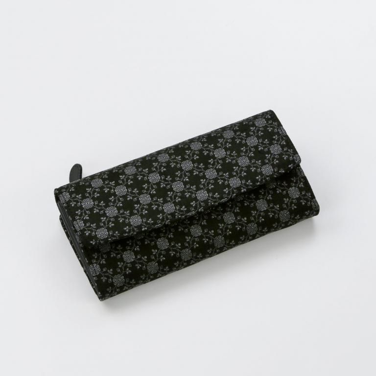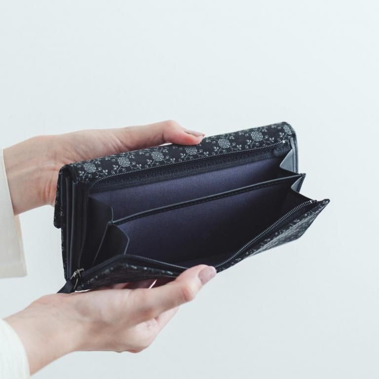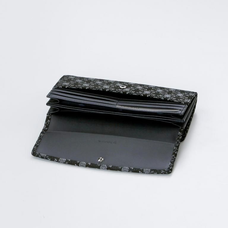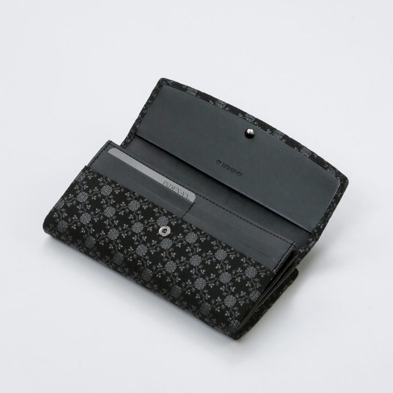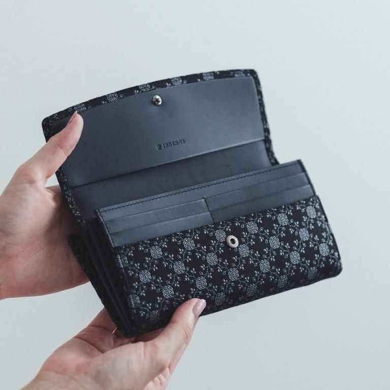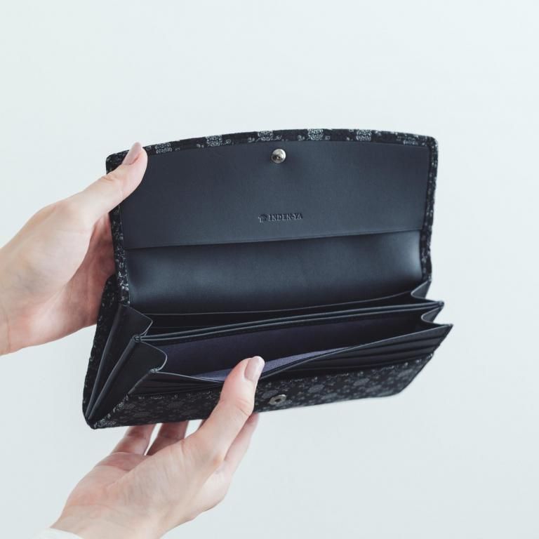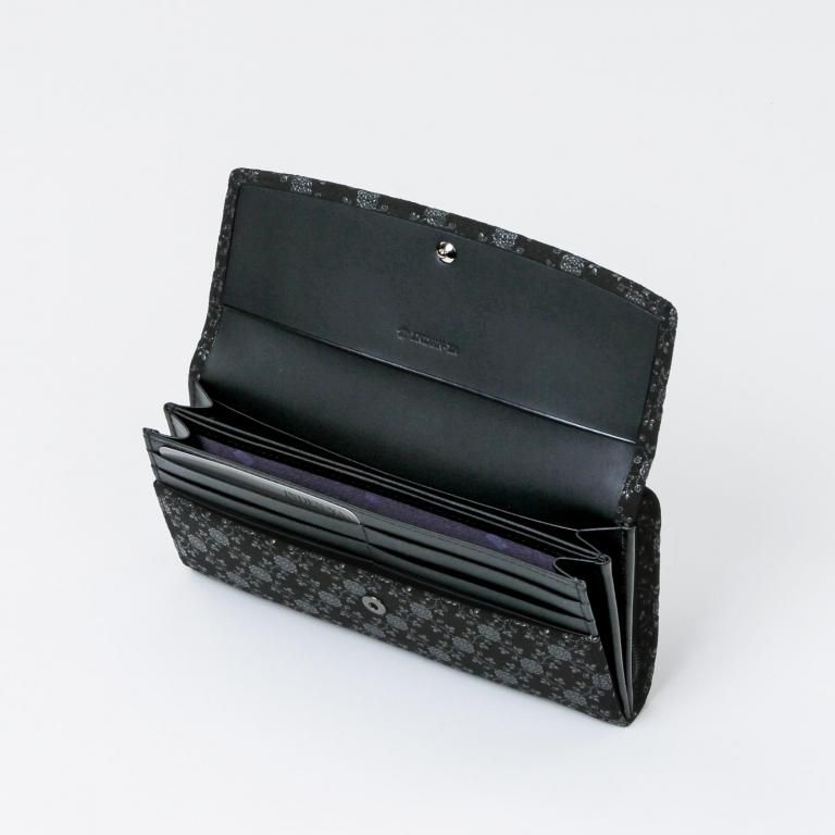 印伝革ならではの手触りと、艶やかな漆模様を贅沢に愉しめるようにデザインした、オーセンティックな長財布。