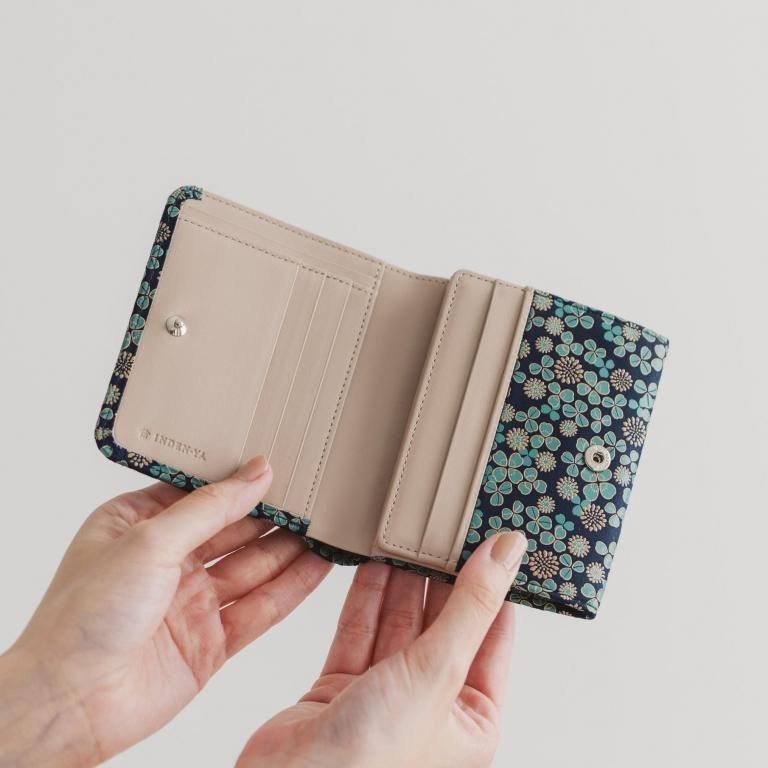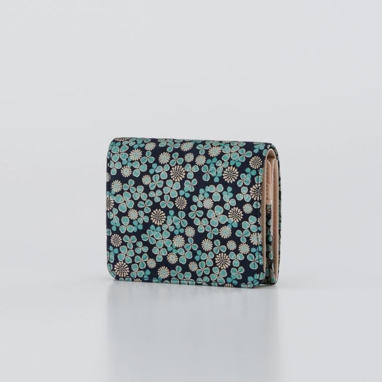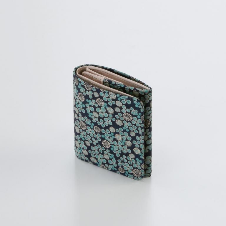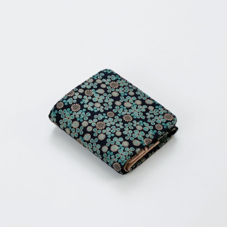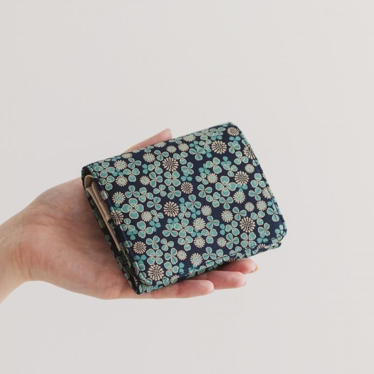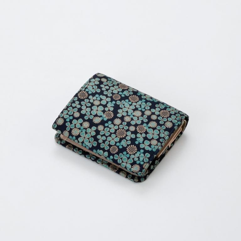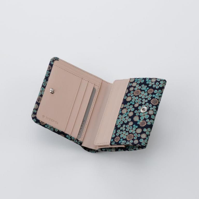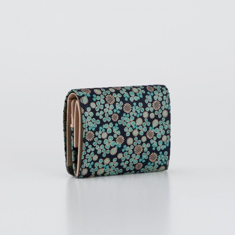 「白詰草の印伝」は、紺色の鹿革に三つ葉とこんもりした花をパステルグリーンの更紗と白漆でつくりあげた印傳屋オリジナルの模様。