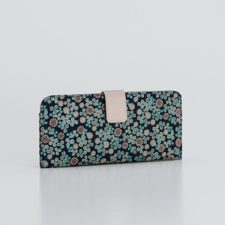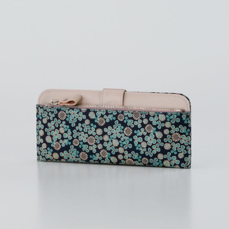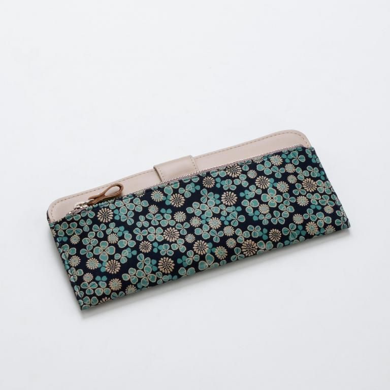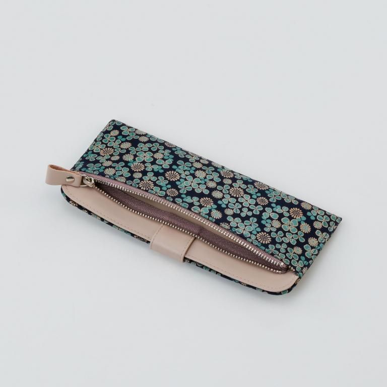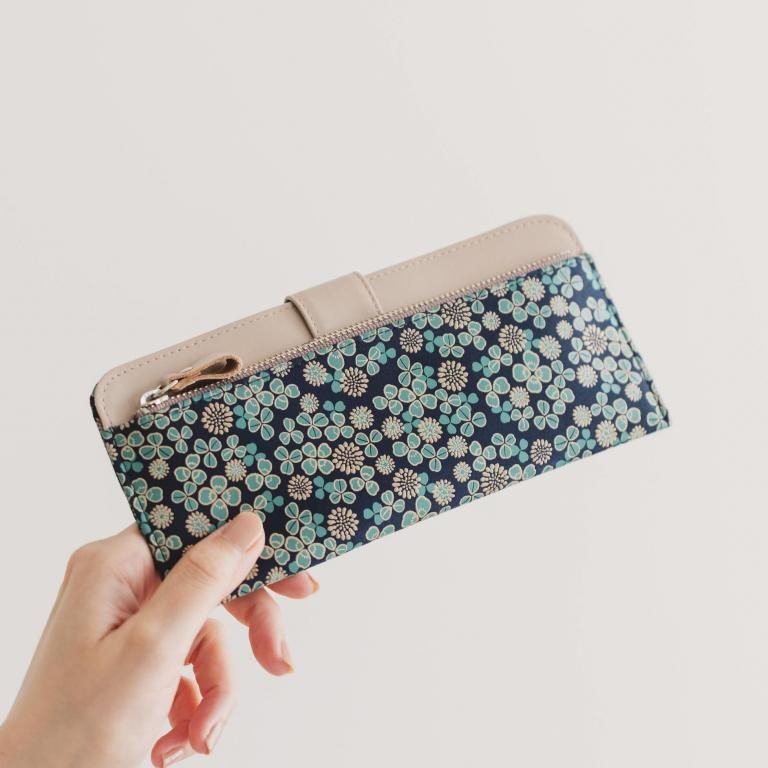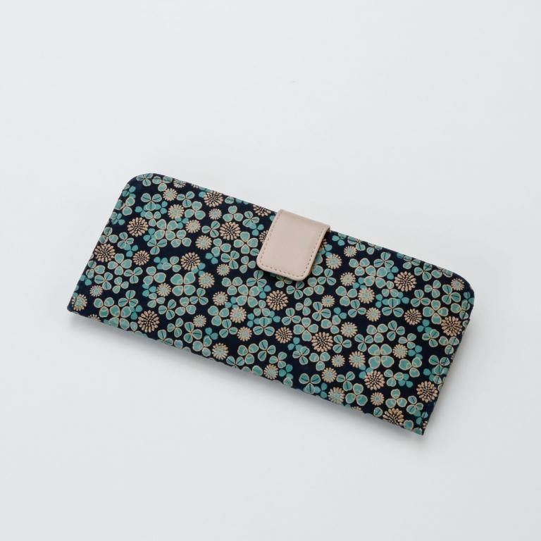 「白詰草の印伝」は、紺色の鹿革に三つ葉とこんもりした花をパステルグリーンの更紗と白漆でつくりあげた印傳屋オリジナルの模様。
