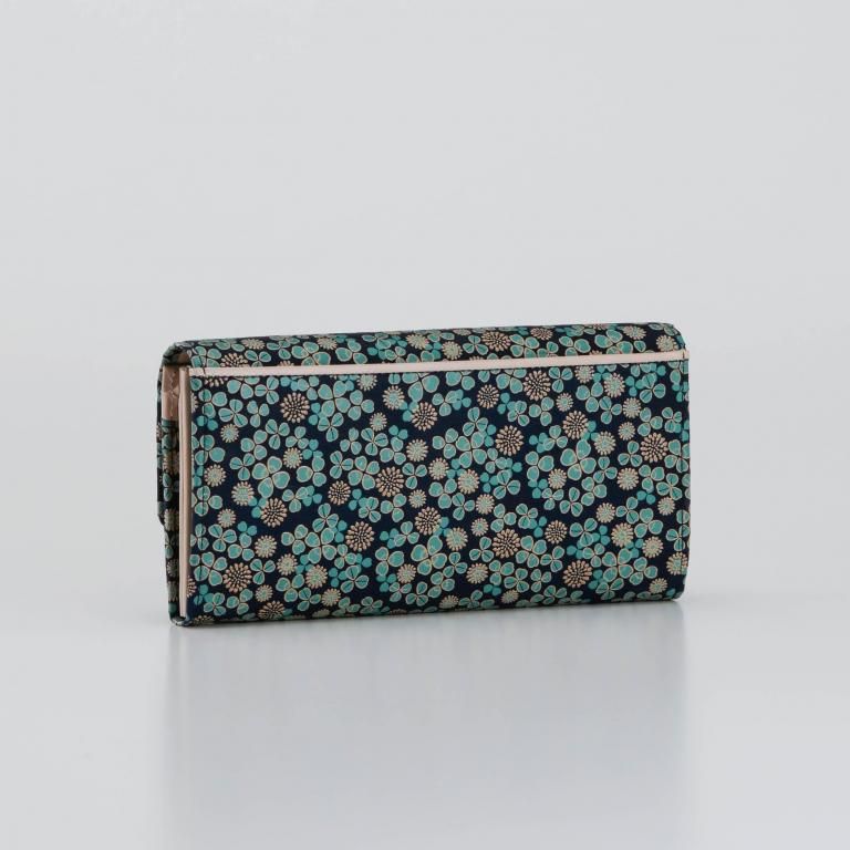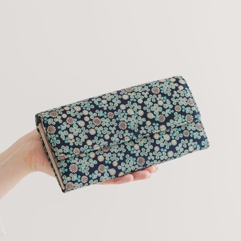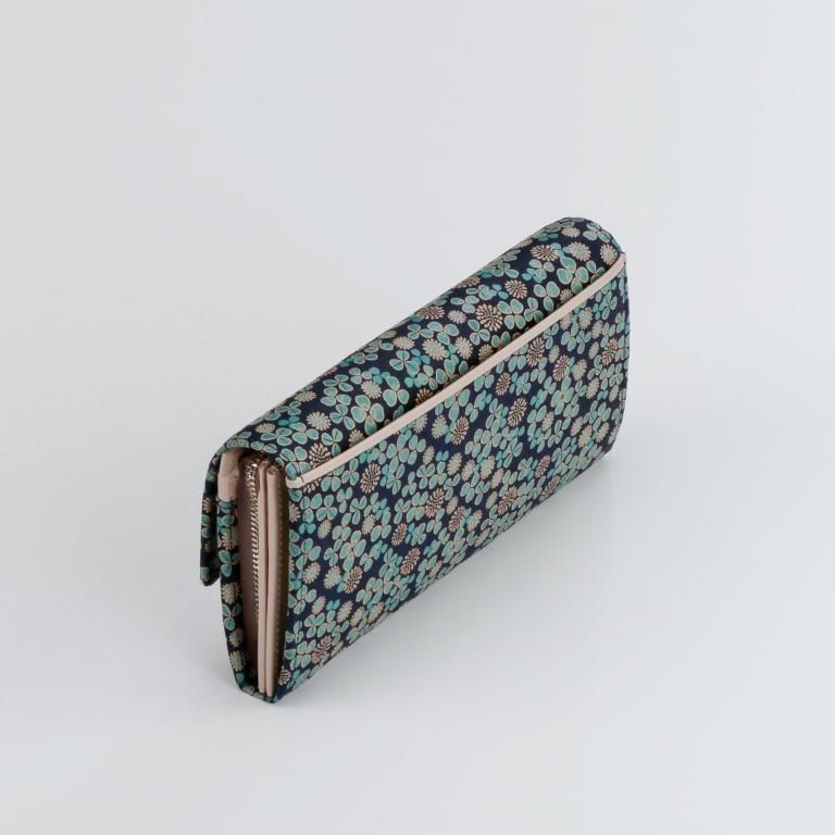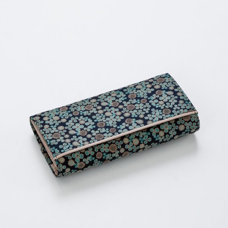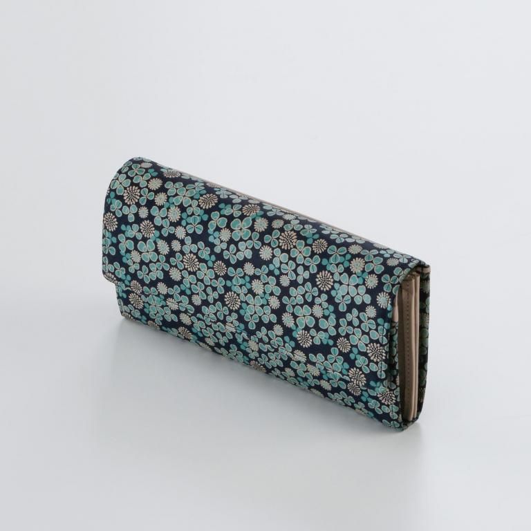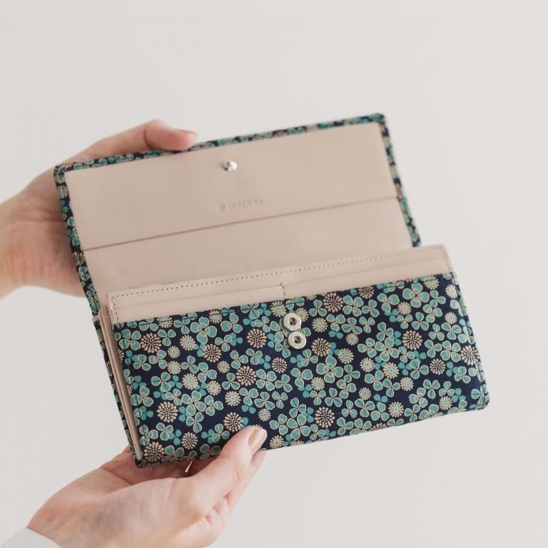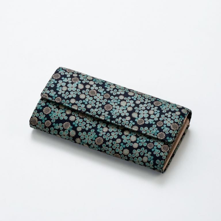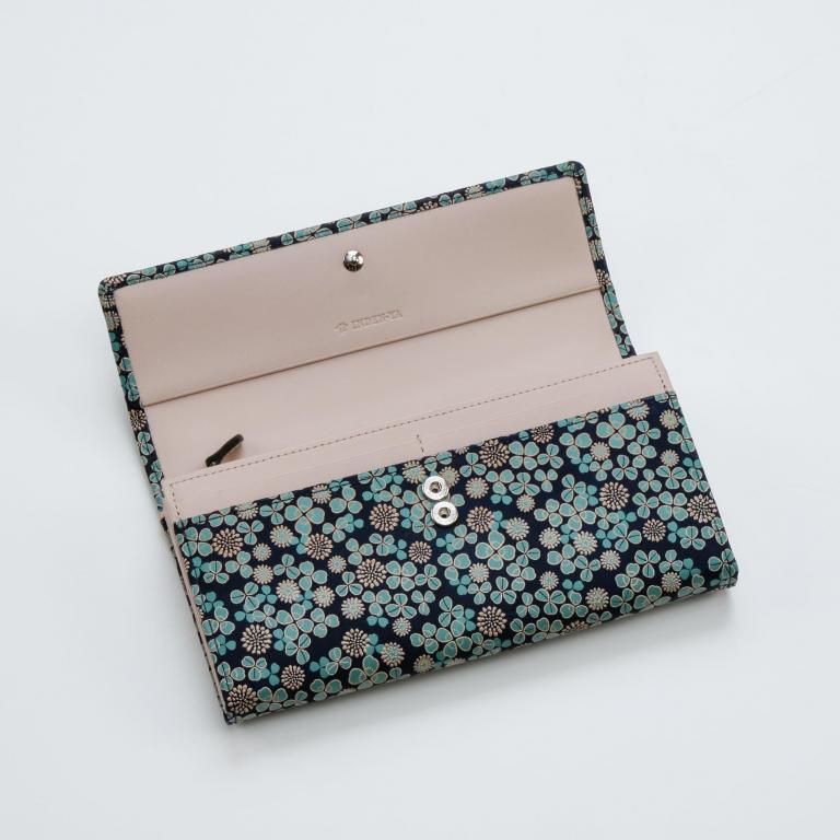 「白詰草の印伝」は、紺色の鹿革に三つ葉とこんもりした花をパステルグリーンの更紗と白漆でつくりあげた印傳屋オリジナルの模様。