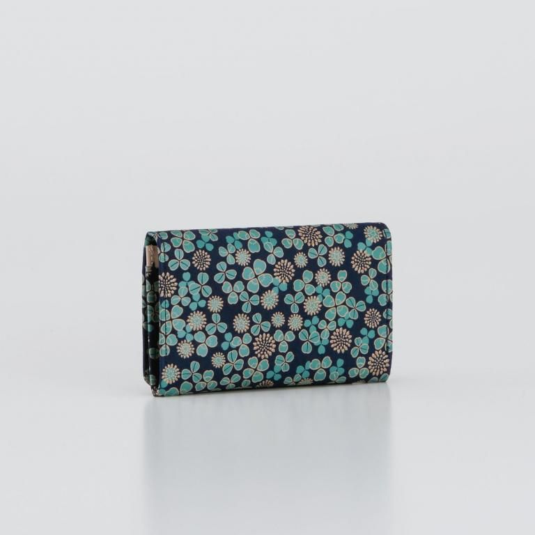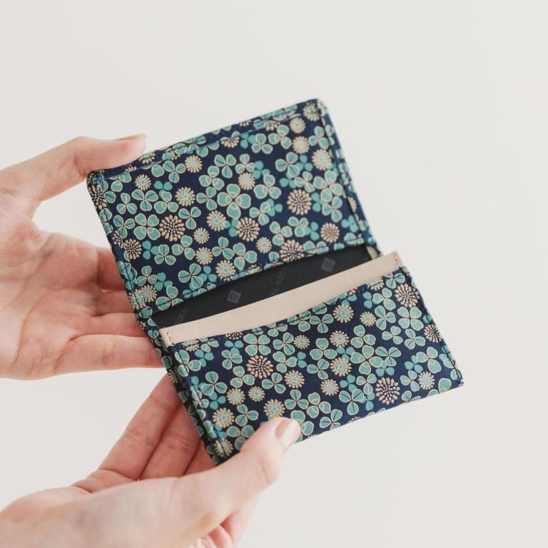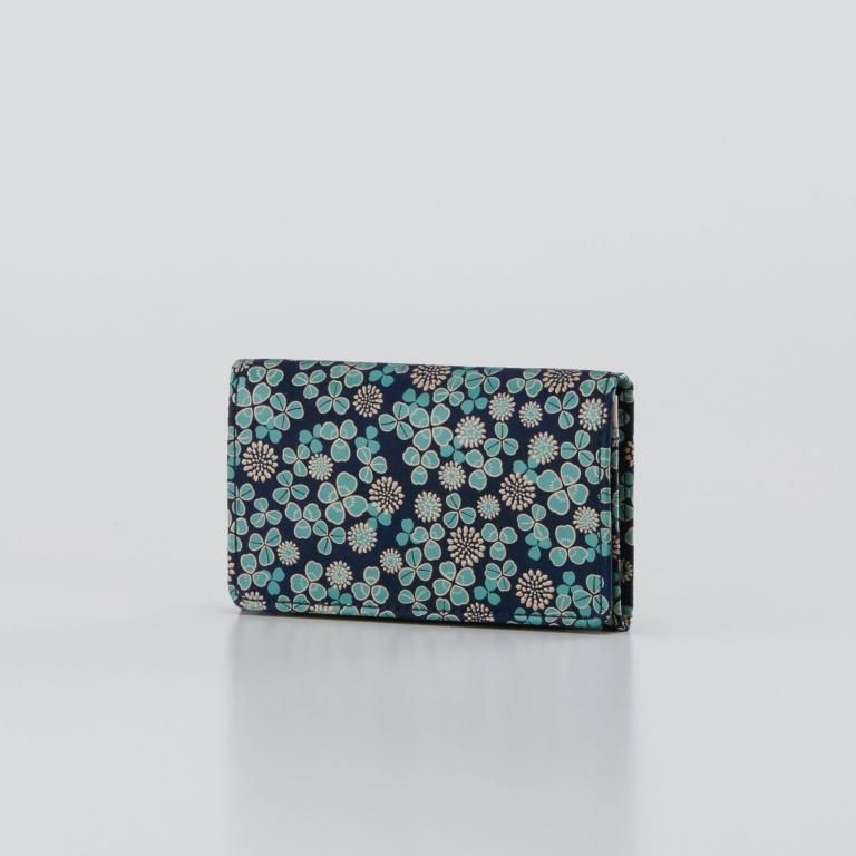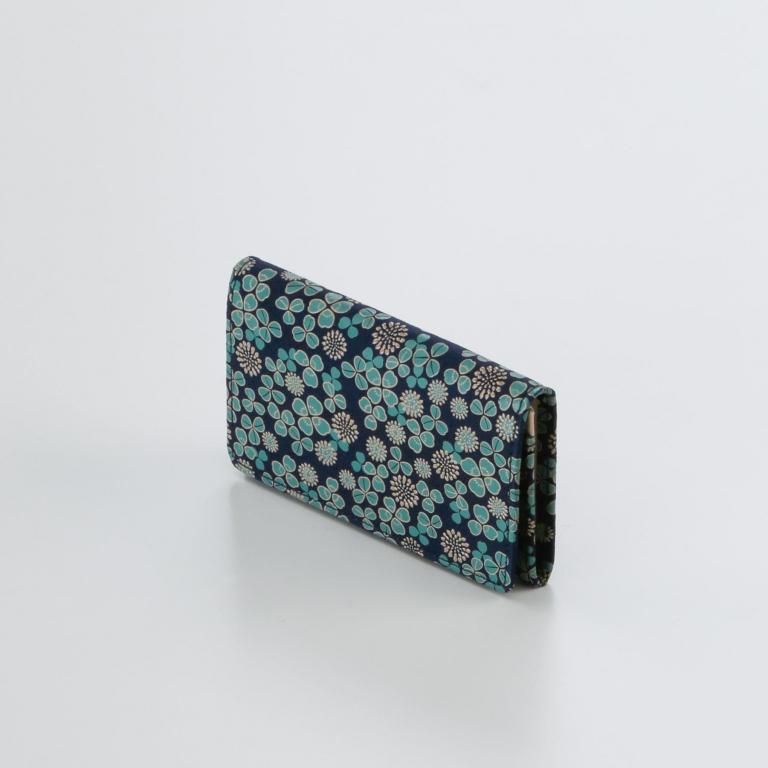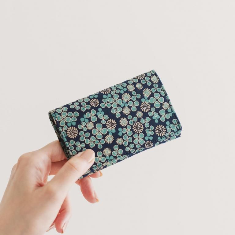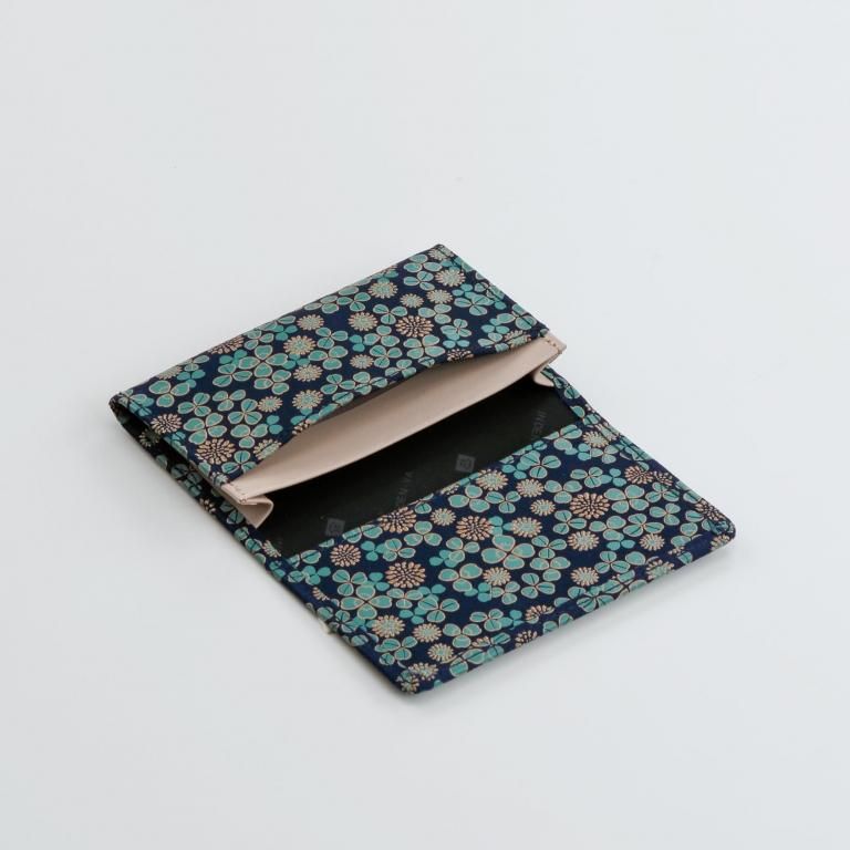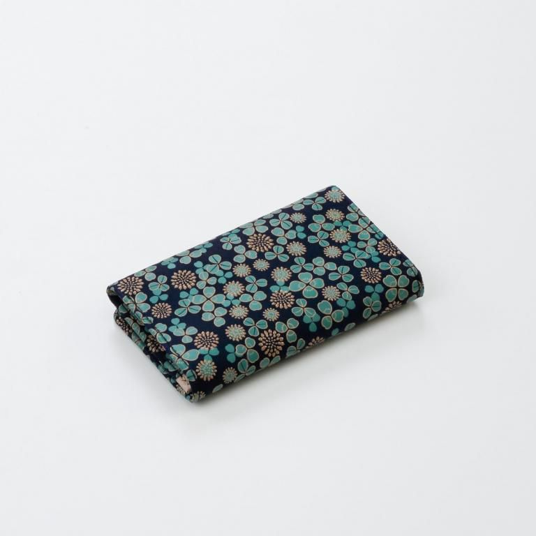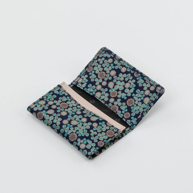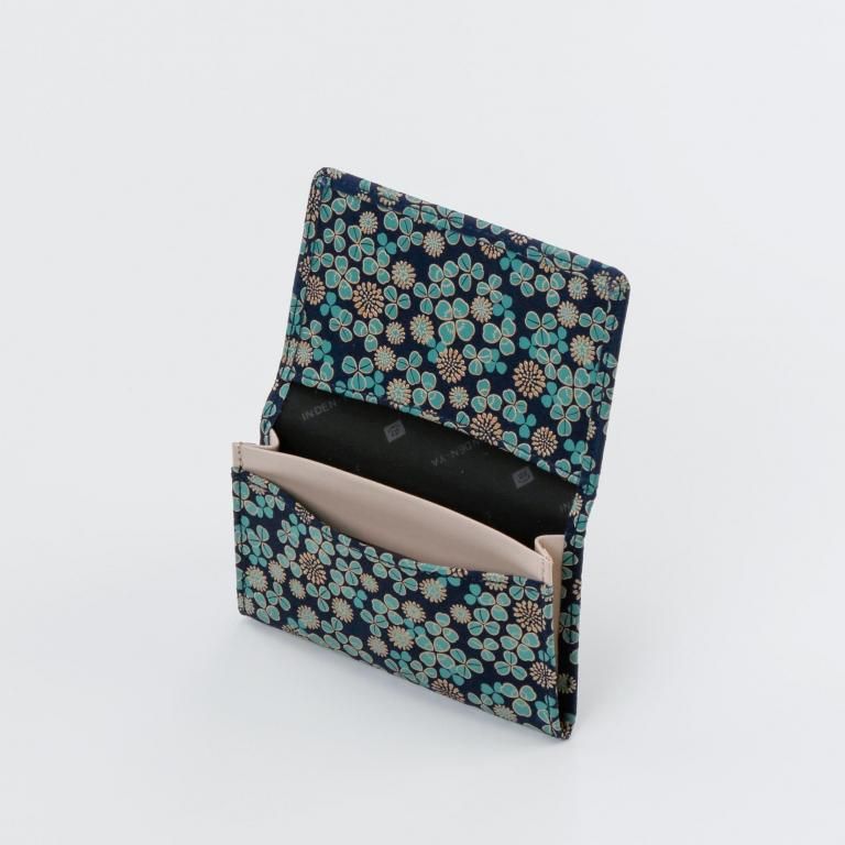 「白詰草の印伝」は、紺色の鹿革に三つ葉とこんもりした花をパステルグリーンの更紗と白漆でつくりあげた印傳屋オリジナルの模様。