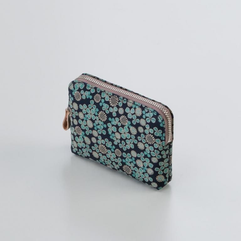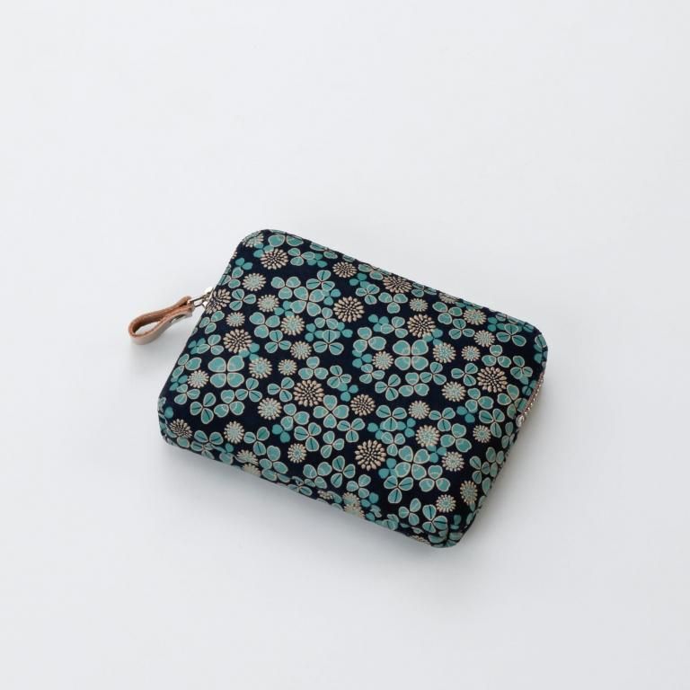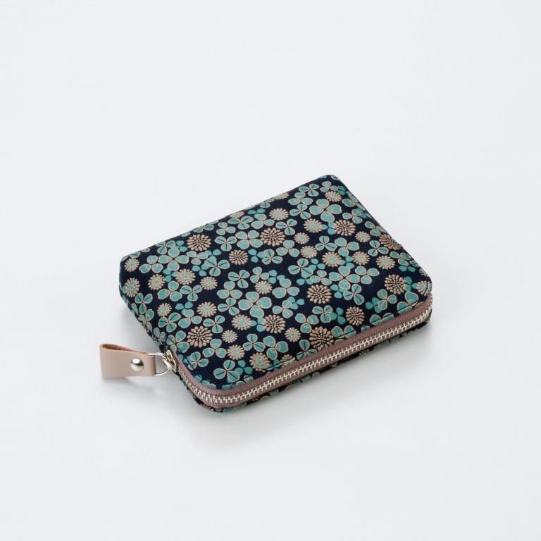 「白詰草の印伝」は、紺色の鹿革に三つ葉とこんもりした花をパステルグリーンの更紗と白漆でつくりあげた印傳屋オリジナルの模様。