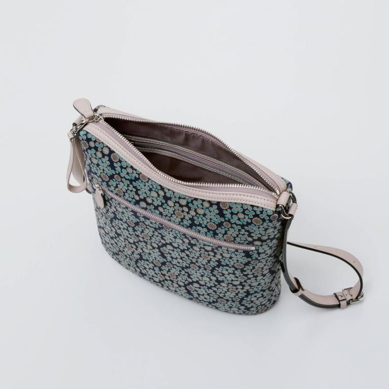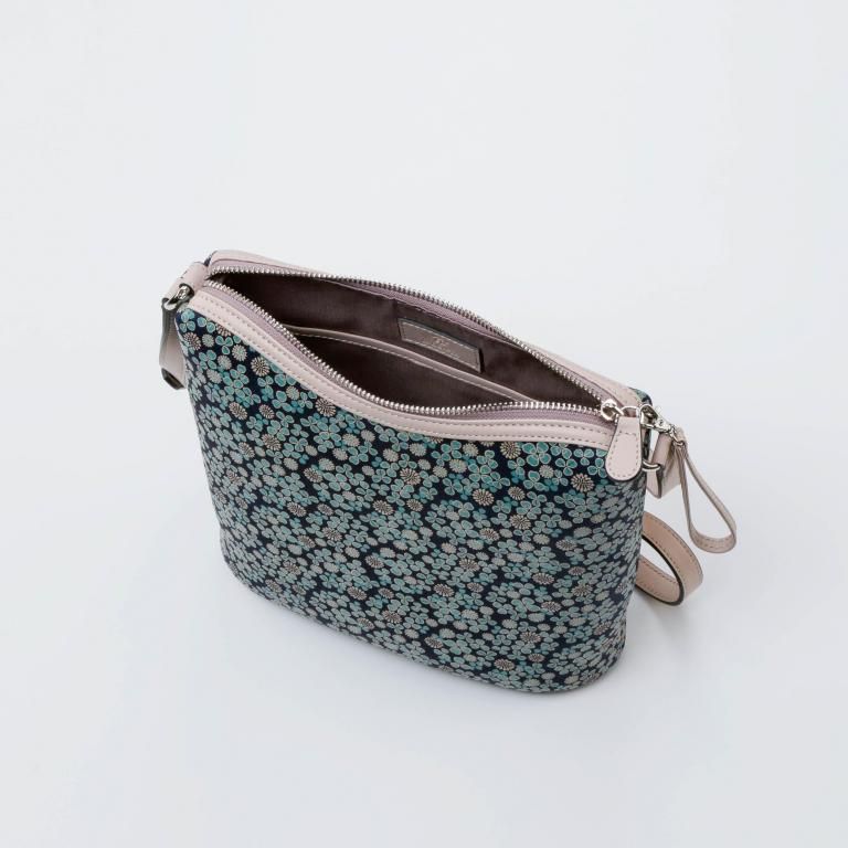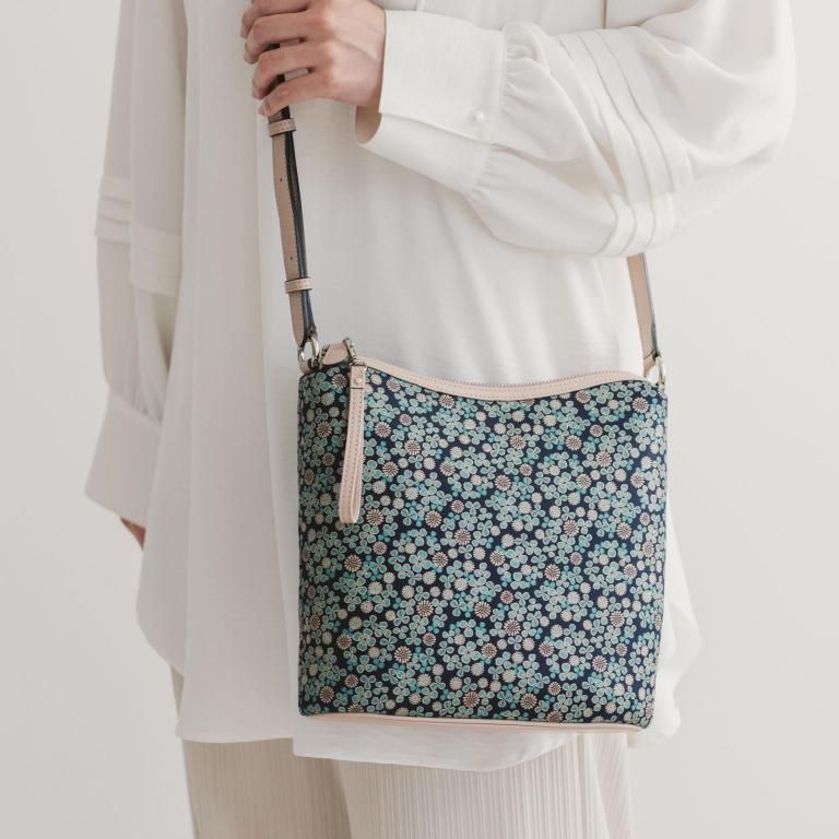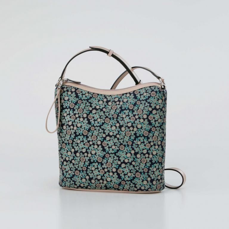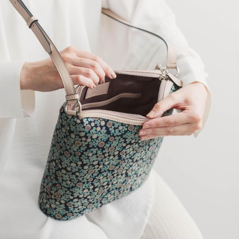 「白詰草の印伝」は、紺色の鹿革に三つ葉とこんもりした花をパステルグリーンの更紗と白漆でつくりあげた印傳屋オリジナルの模様。