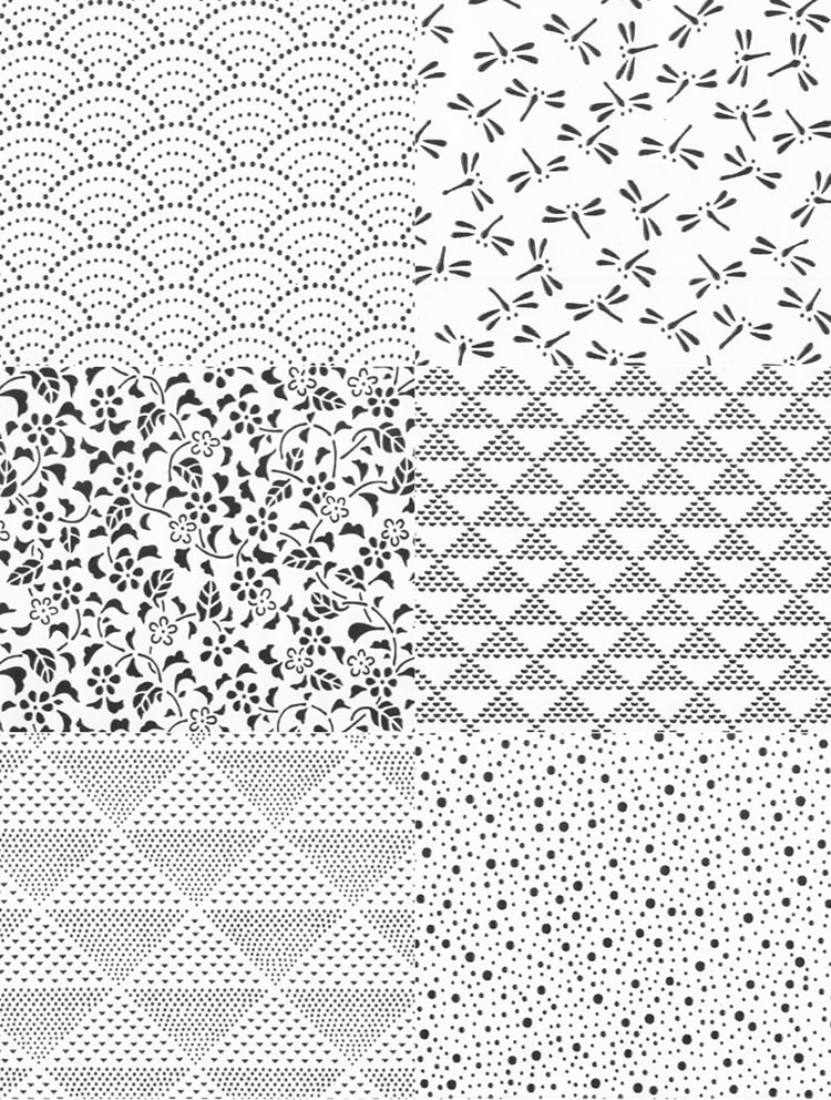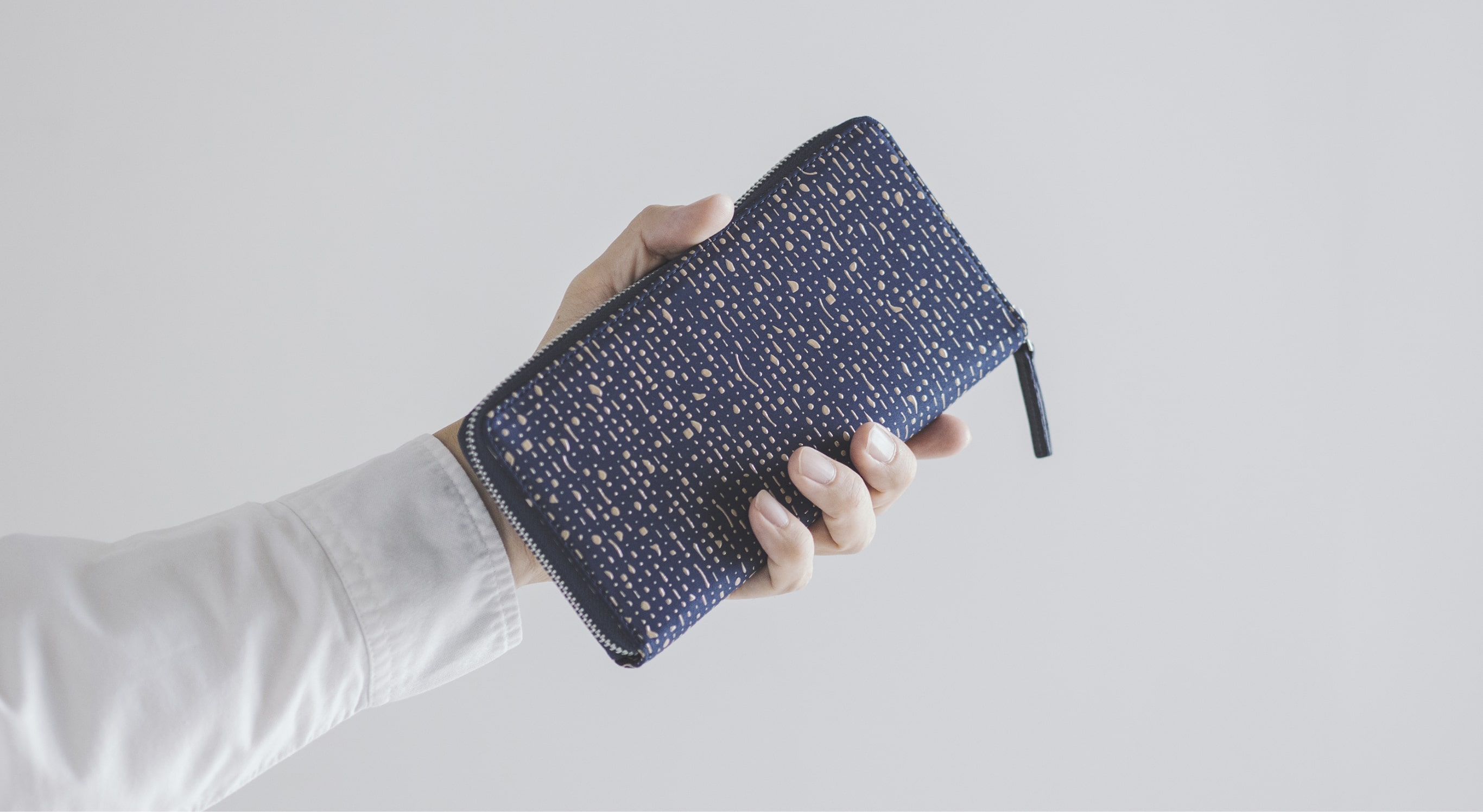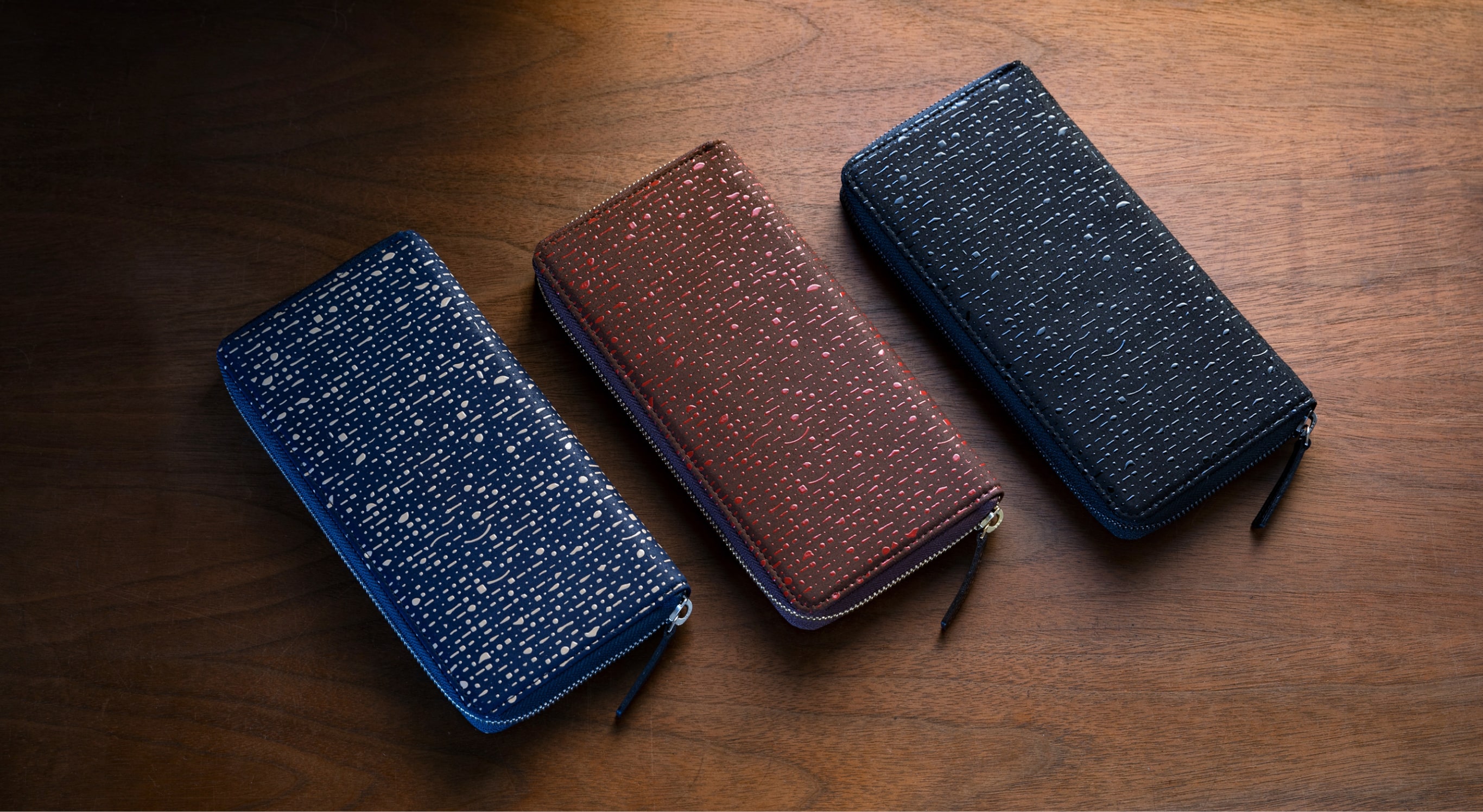 青海波や蜻蛉、瓢箪など印傳屋に受け継がれる模様の型紙から一片一片を抽出し、数多の点と線で紡ぎ出した縞模様。江戸時代、庶民が粋を競ってさまざまな縞模様を生み出したように、これまでにない自由な発想で現代の縞模様をつくるべく、プロダクトデザイナー齋藤駿(Shun Saito) 氏の協力のもとにつくりあげたものです。