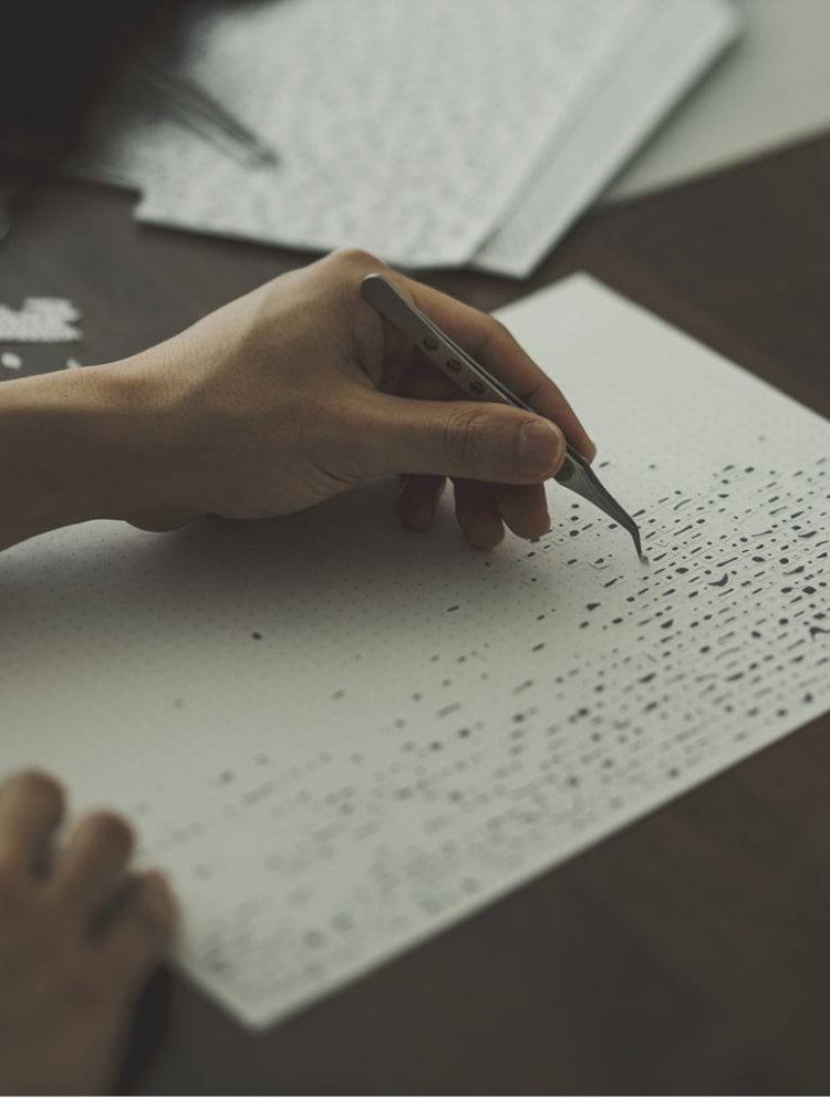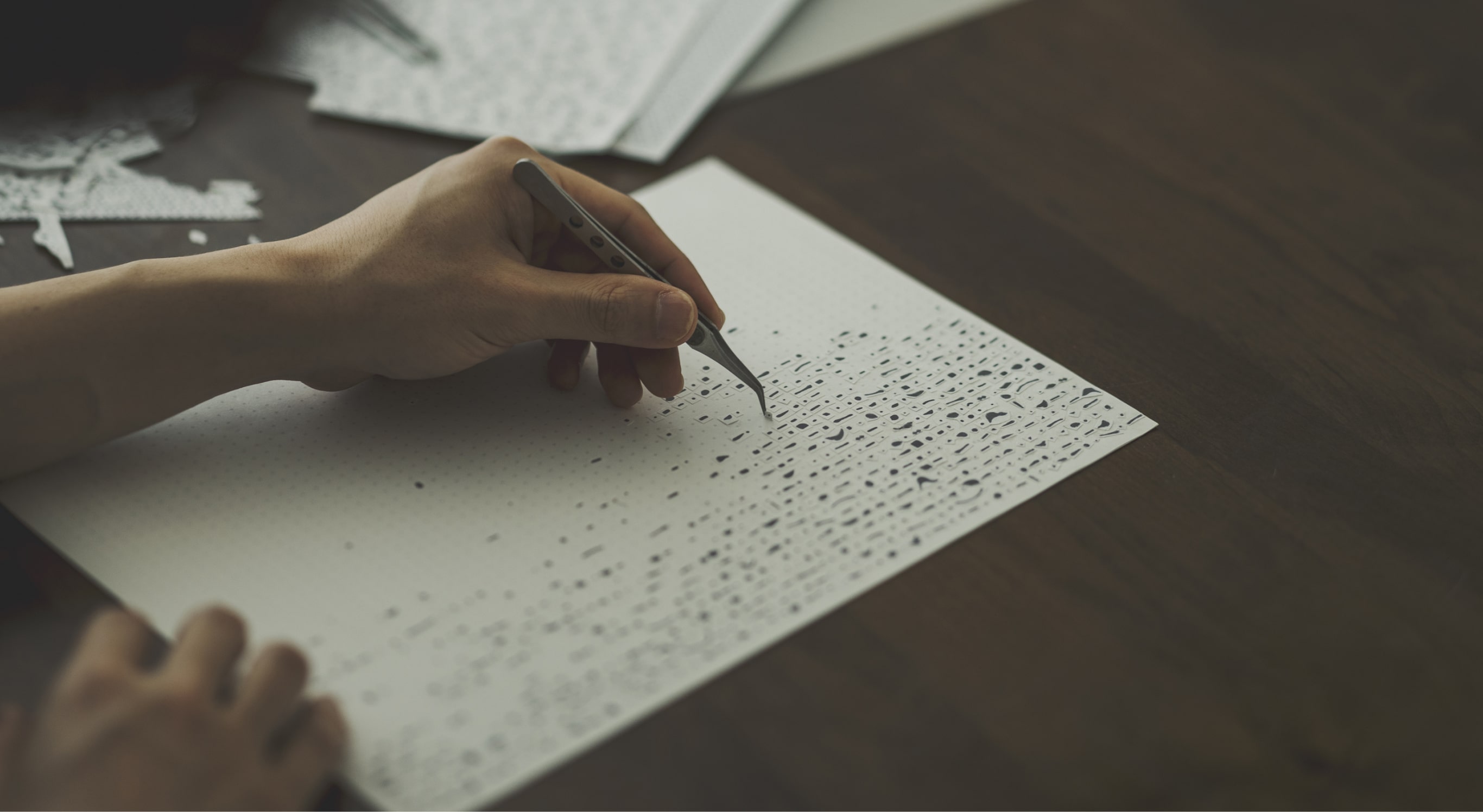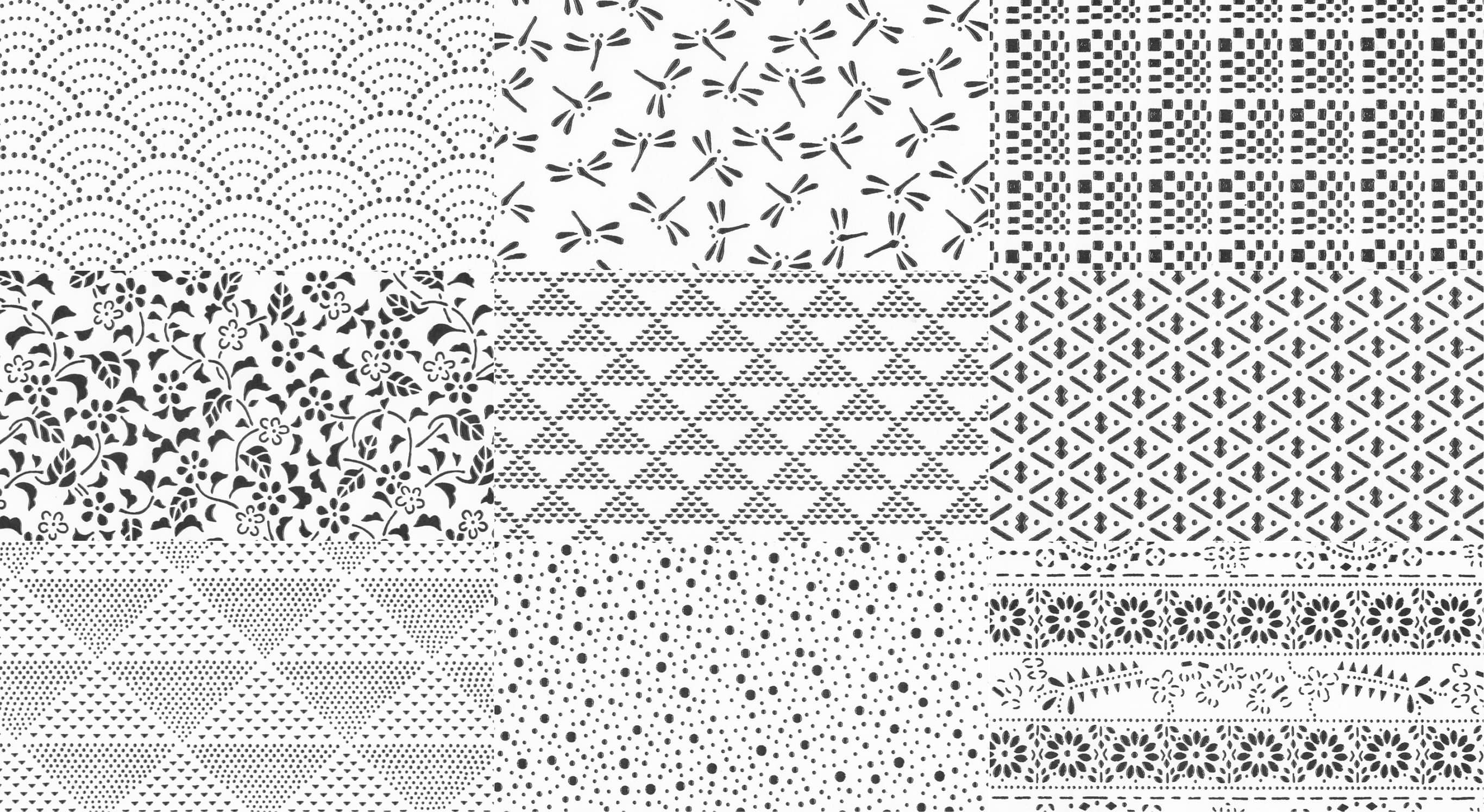 青海波や蜻蛉、瓢箪など印傳屋に受け継がれる模様の型紙から一片一片を抽出し、数多の点と線で紡ぎ出した縞模様。江戸時代、庶民が粋を競ってさまざまな縞模様を生み出したように、これまでにない自由な発想で現代の縞模様をつくるべく、プロダクトデザイナー齋藤駿(Shun Saito) 氏の協力のもとにつくりあげたものです。