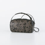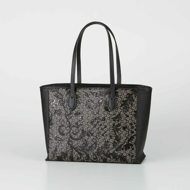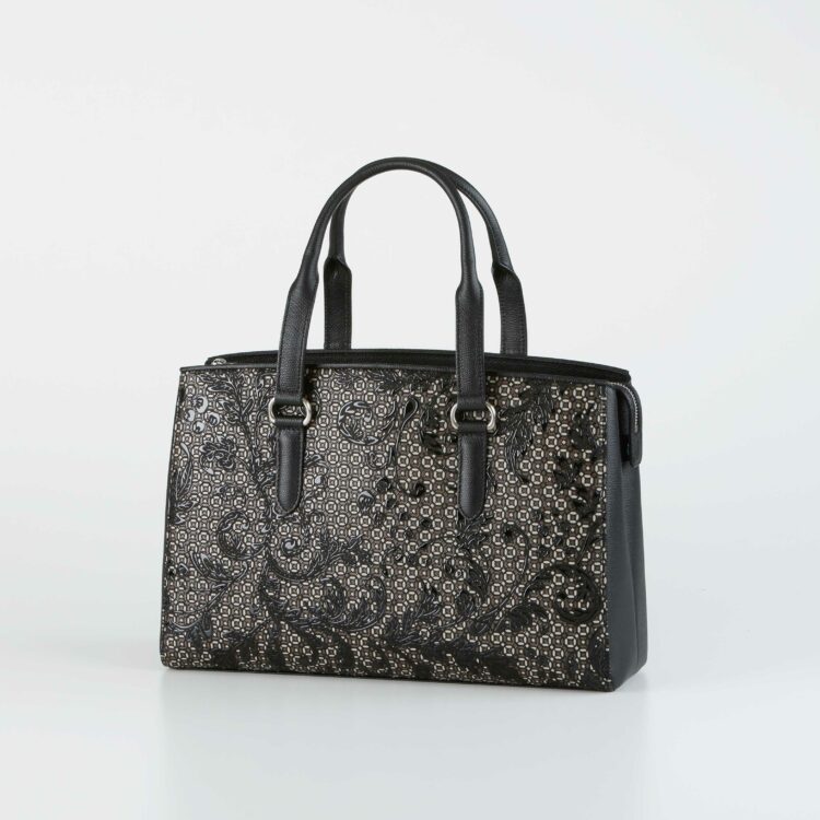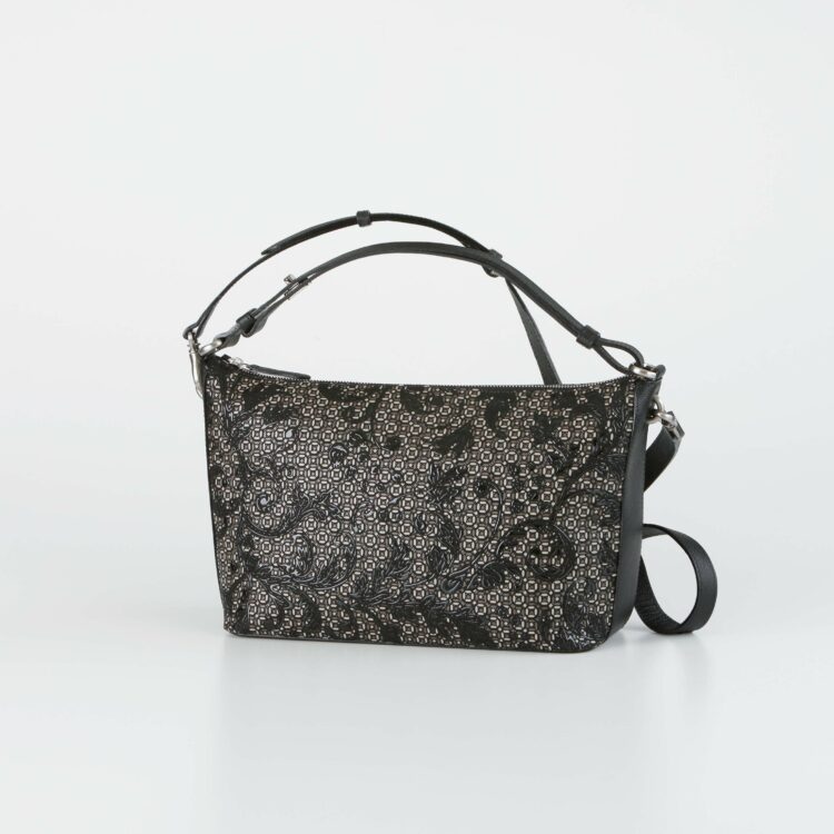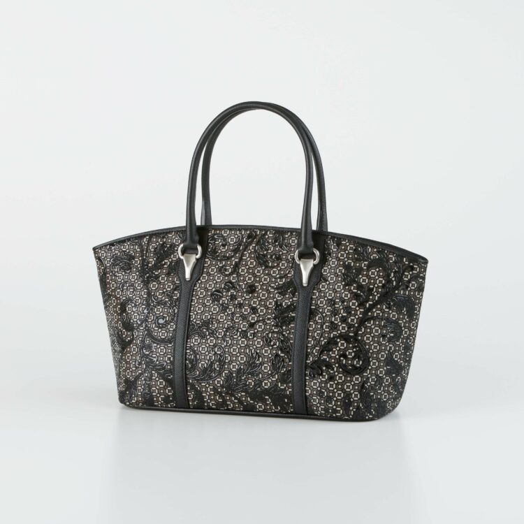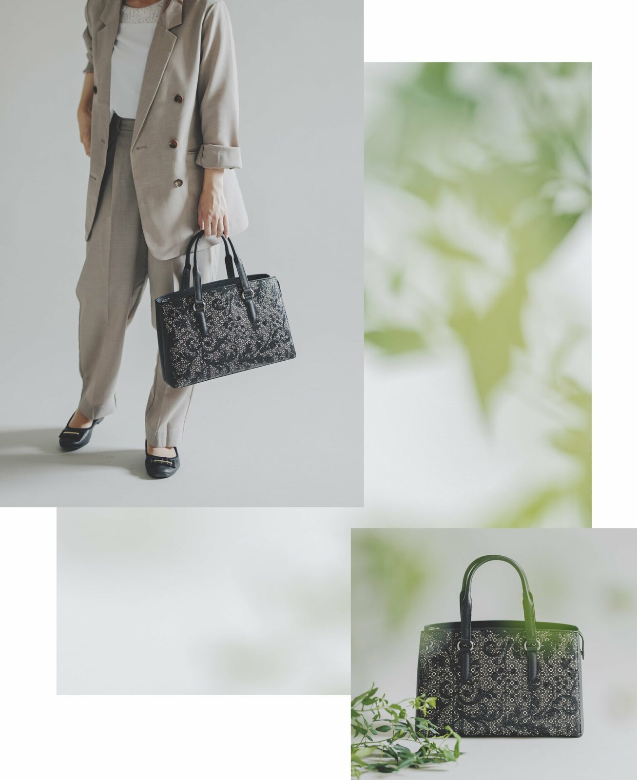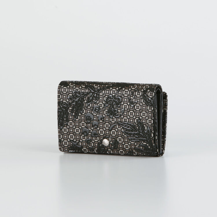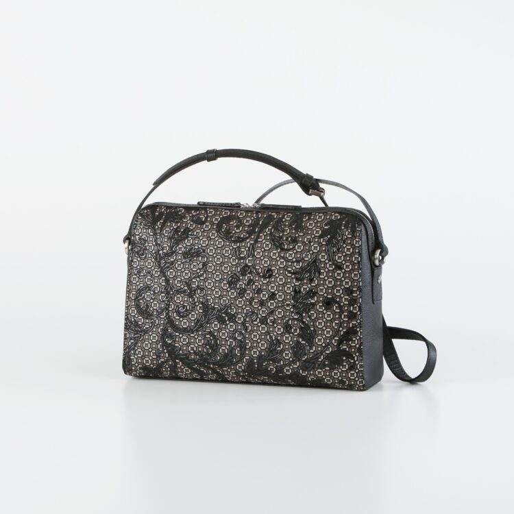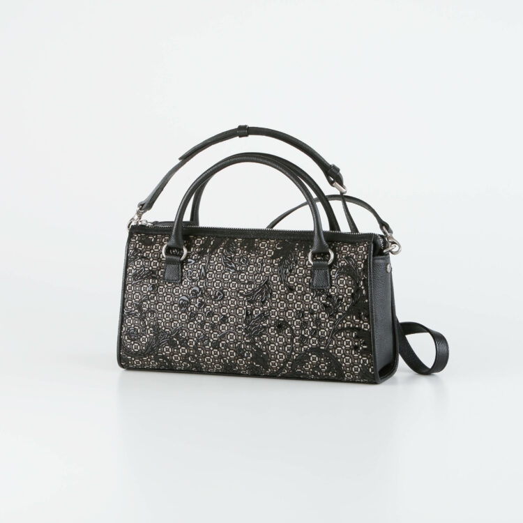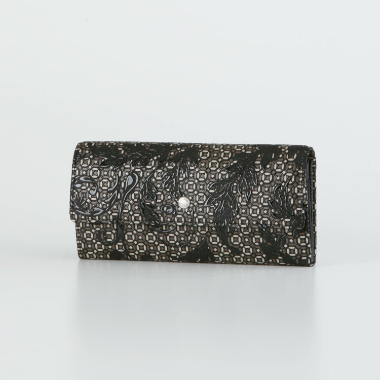 伝統の七宝繋ぎ文様をアレンジし更紗と漆で立体的に表現。ベースとなる黒の鹿革を更紗で型抜きし、ボタニカルシルエットを浮かび上がらせる独自の手法でつくりました。