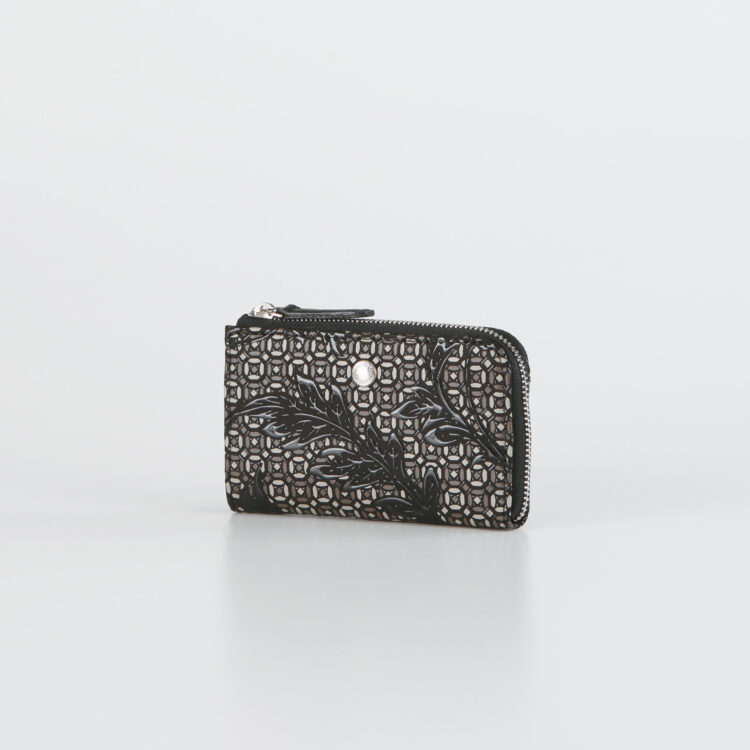縁の繋がりや円満を表す吉祥文様の七宝繋ぎ。そこに生命力溢れる植物が生き生きと浮かび上がる。豊かな未来へどこまでも永遠に伸びゆく力を意匠化した印傳屋オリジナルブランドです。