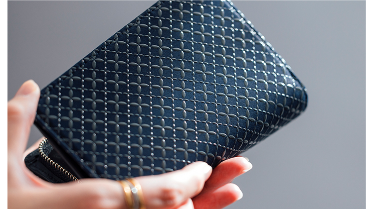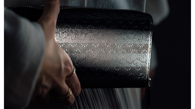 印伝といえば、模様の漆付け。中でも近年人気の高い色がグレー漆。黒や紺の落ち着いた色調の地色にグレーの模様で描くと全体のコントラストがおさえられ、シックな雰囲気に。今年度は新たに「網代格子」の模様も加え、グレー漆を用いたパターンを新たに6種追加。落ち着きのある大人のアイテムがより豊富に。