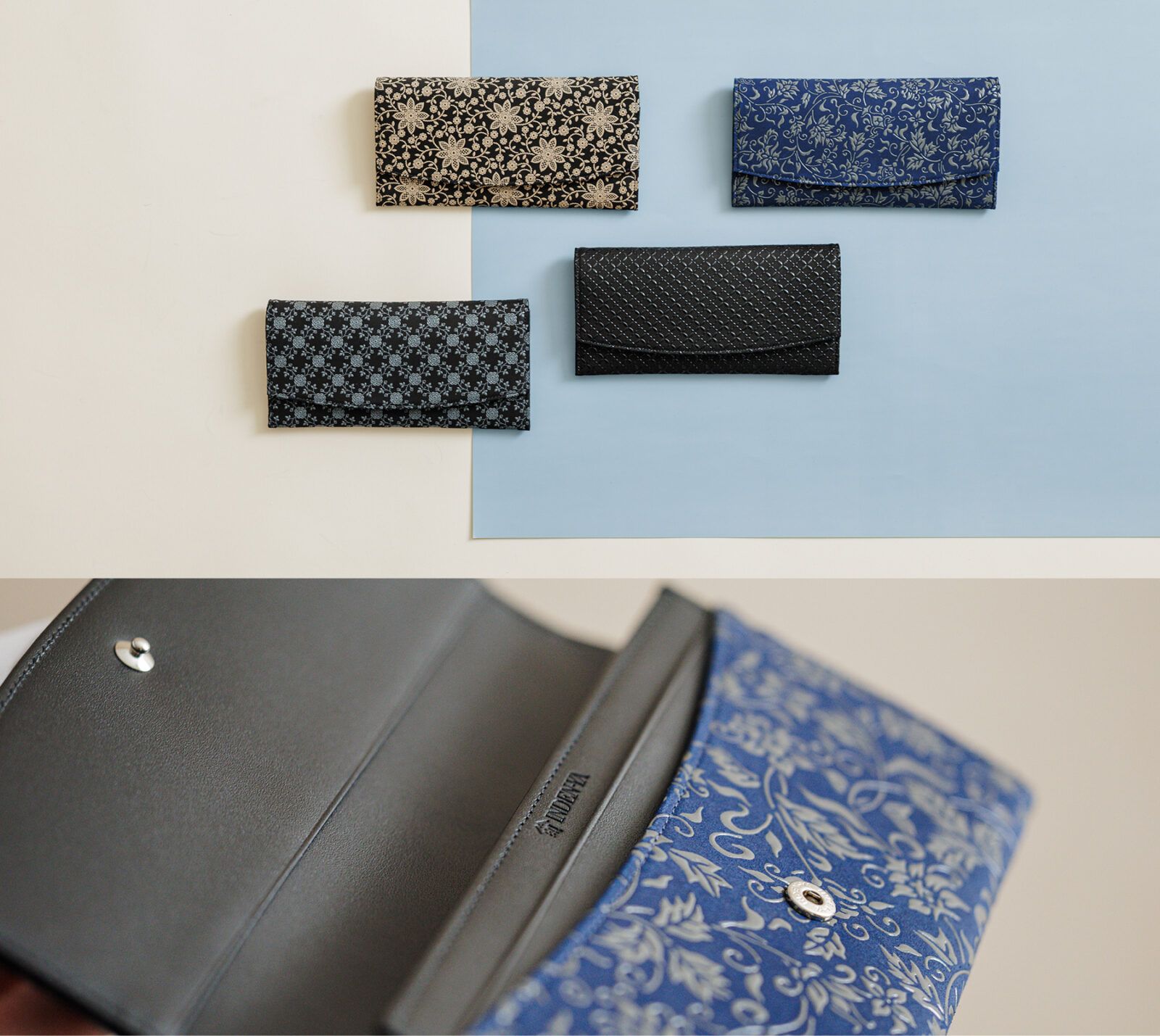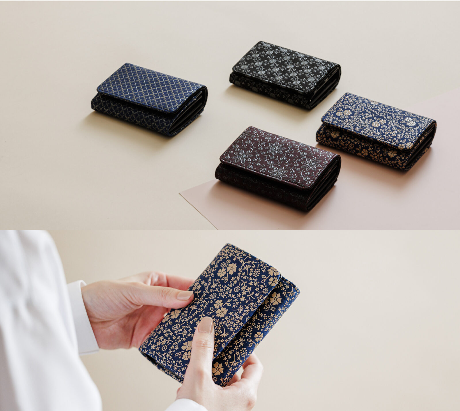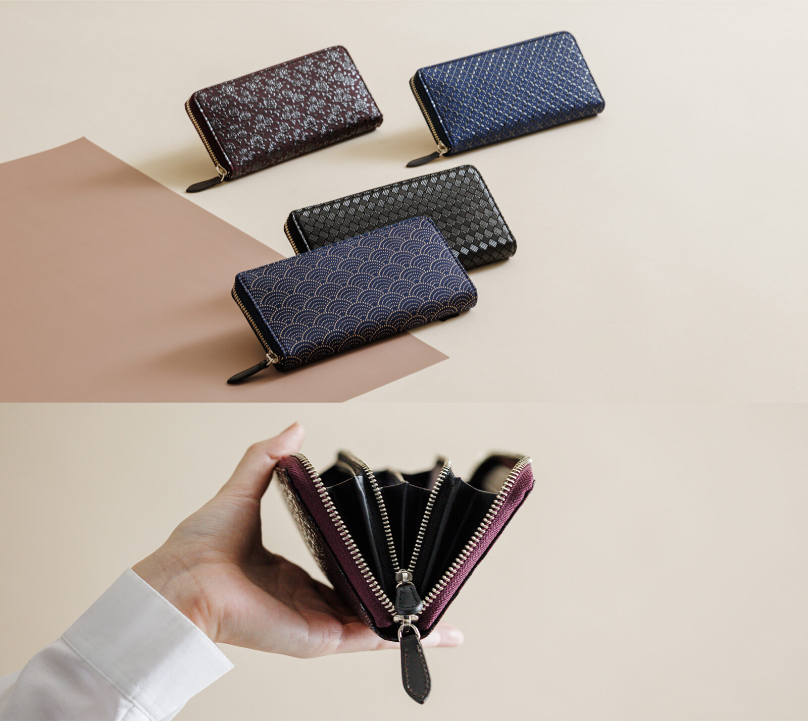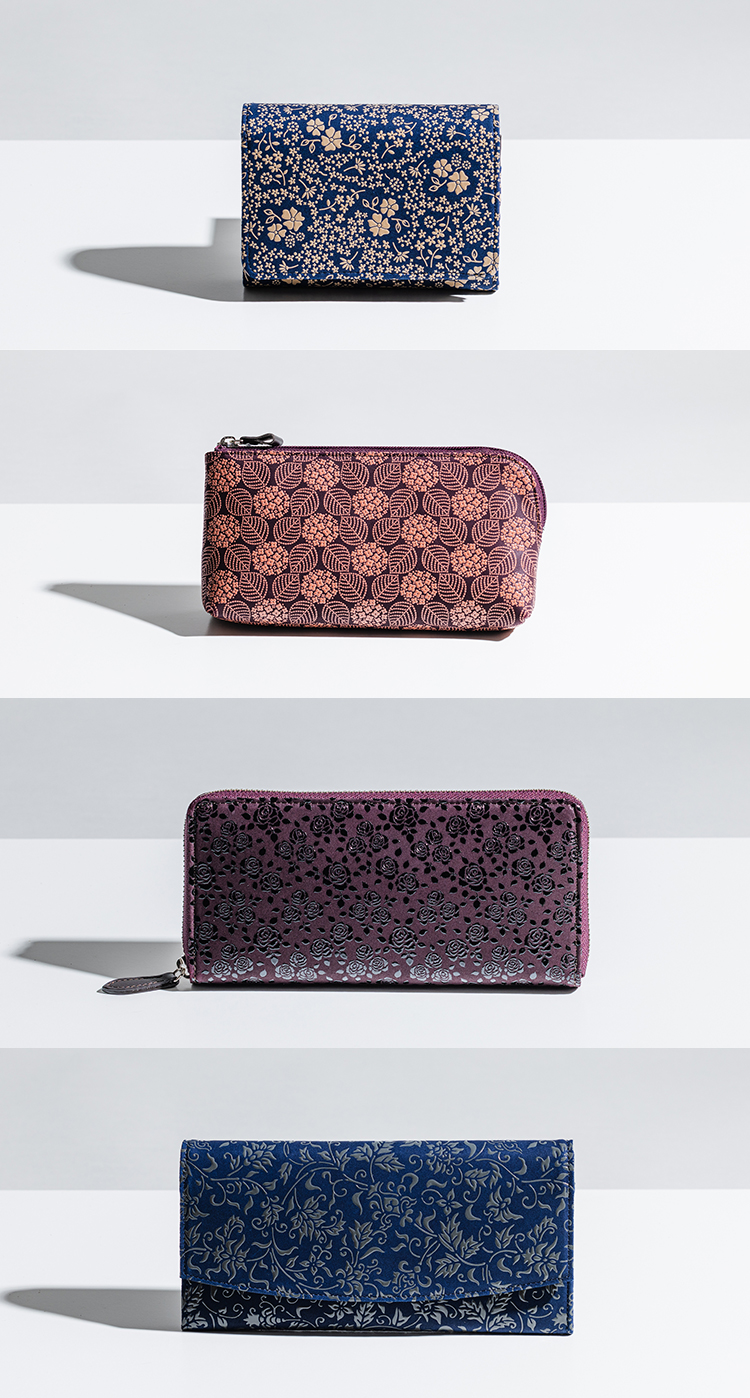 印伝は鹿革に漆の模様が代名詞ですが、日々使う暮らしの道具として、使いやすさにもこだわりがあります。ファスナーの開きやすさ、取り出しやすさなどより扱いやすい形状や仕様、より心地よいデザインにできないか。毎年さらなるバージョンアップを重ね、新商品をラインアップに加えています。