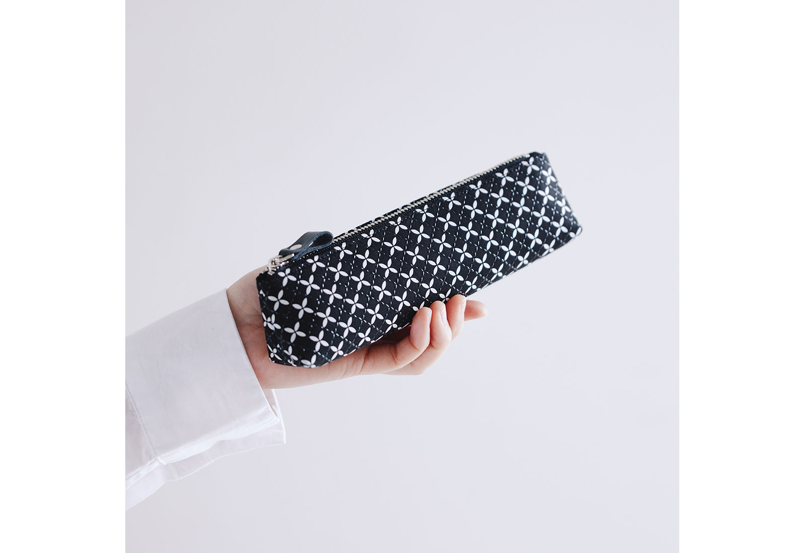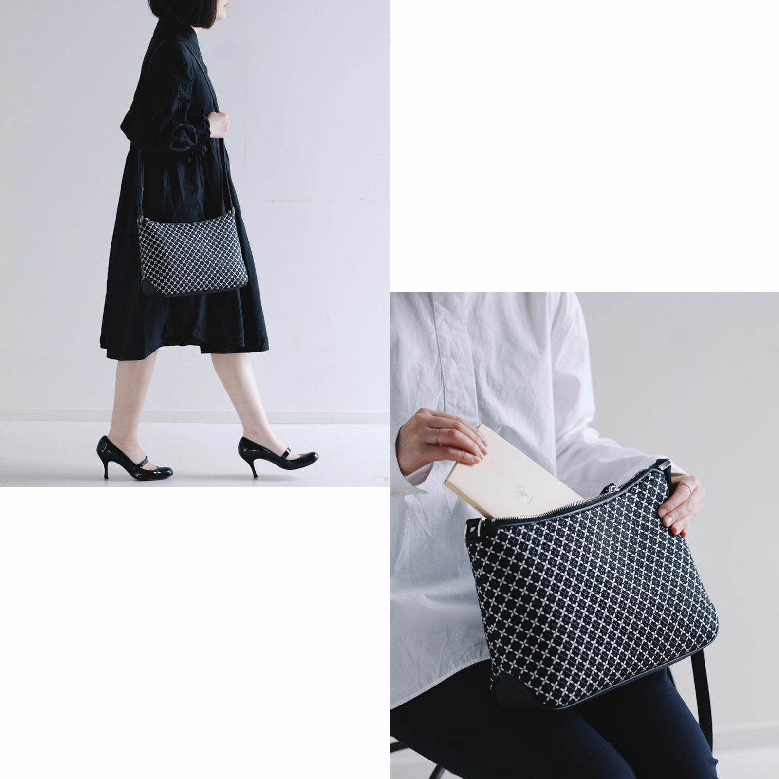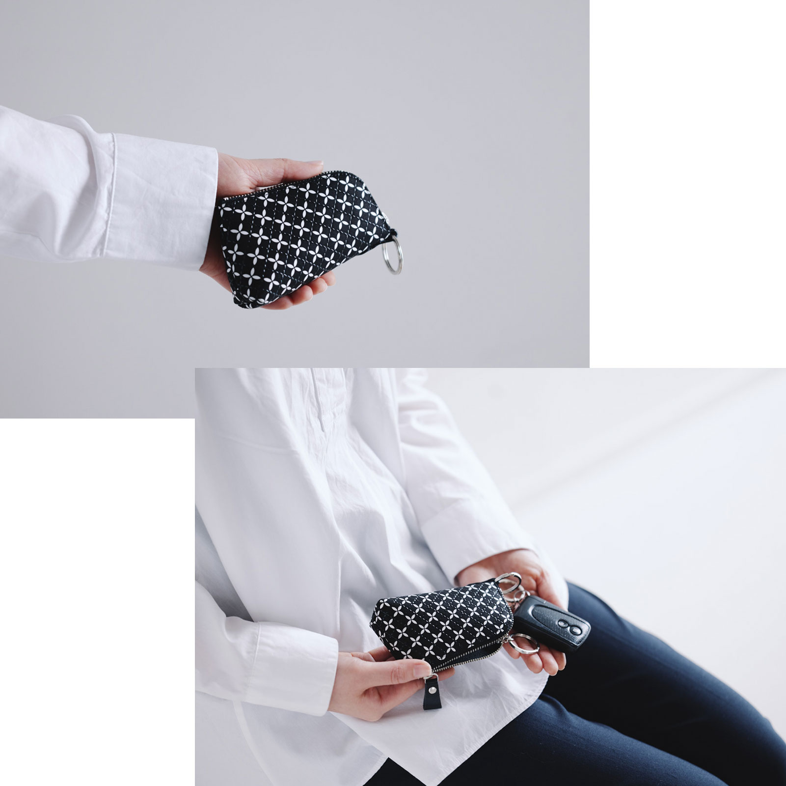 縁の繋がりや円満、調和などを表す吉祥文様として広まった「七宝繋ぎ」模様を、白と黒のコントラストで描き、“こころの和によって生まれるかたち”をコンセプトに誕生した創作シリーズ「そよか」。鹿革の黒地に重なり合う想いを白の更紗で、それを取り囲むように黒の細かい漆で、人との見えない結びつきを表しています。